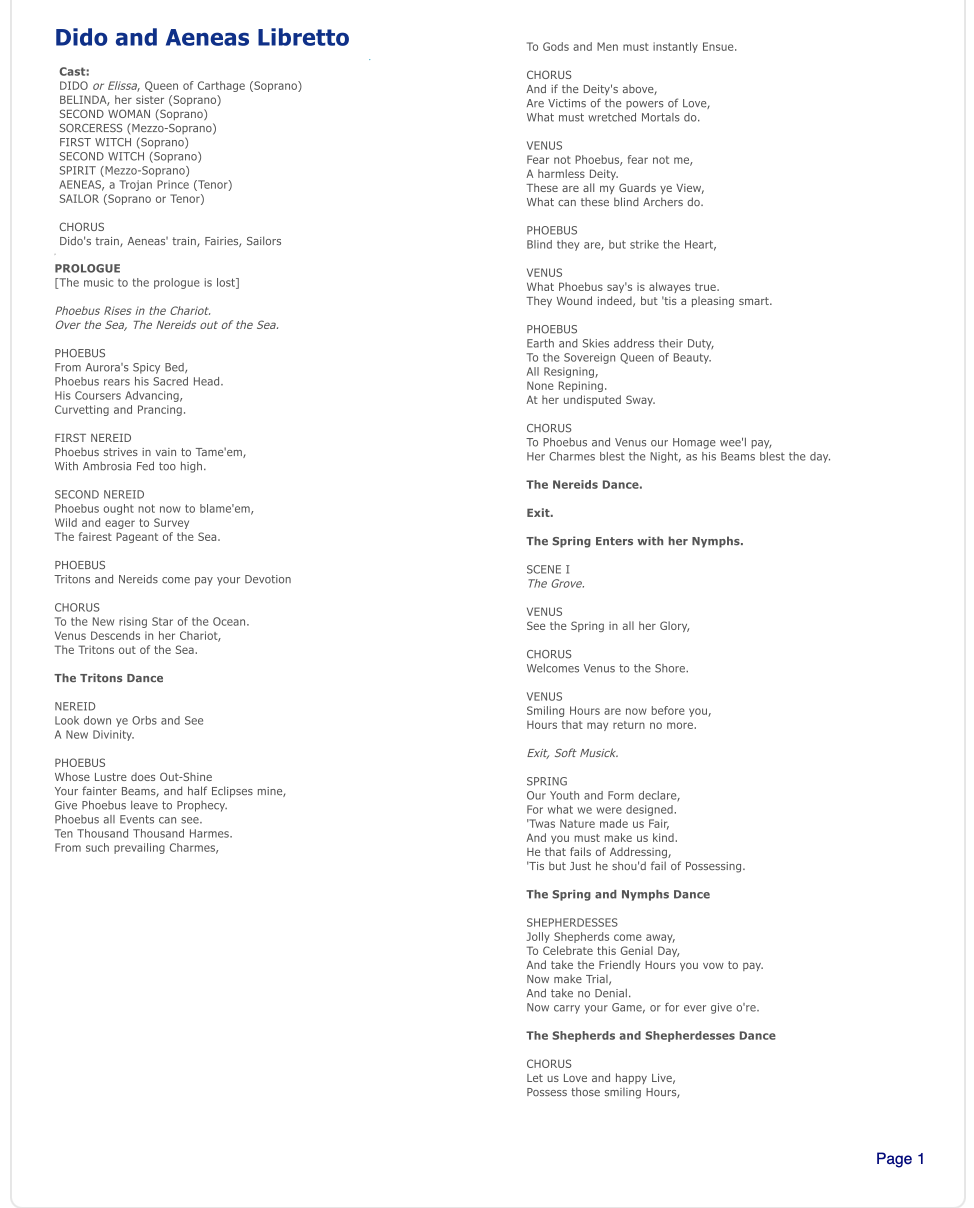 Dido and Aeneas was the first opera written in English by Henry Purcell in 1689. This was a commission from the Josias Priest Girls School in London. The libretto was by Nahum Tate, an Irish-Anglo poet. Tate (née Teate) based the libretto on Virgil's (70BC - 19BC) epic 10,000 line poem, The Aeneid, which recounts Aeneas' wanderings from Troy to Italy. From the title we know that there are two main characters: Dido, Queen of Carthage, and Aeneas, surivivor of the Trojan war and alleged founder of Rome.