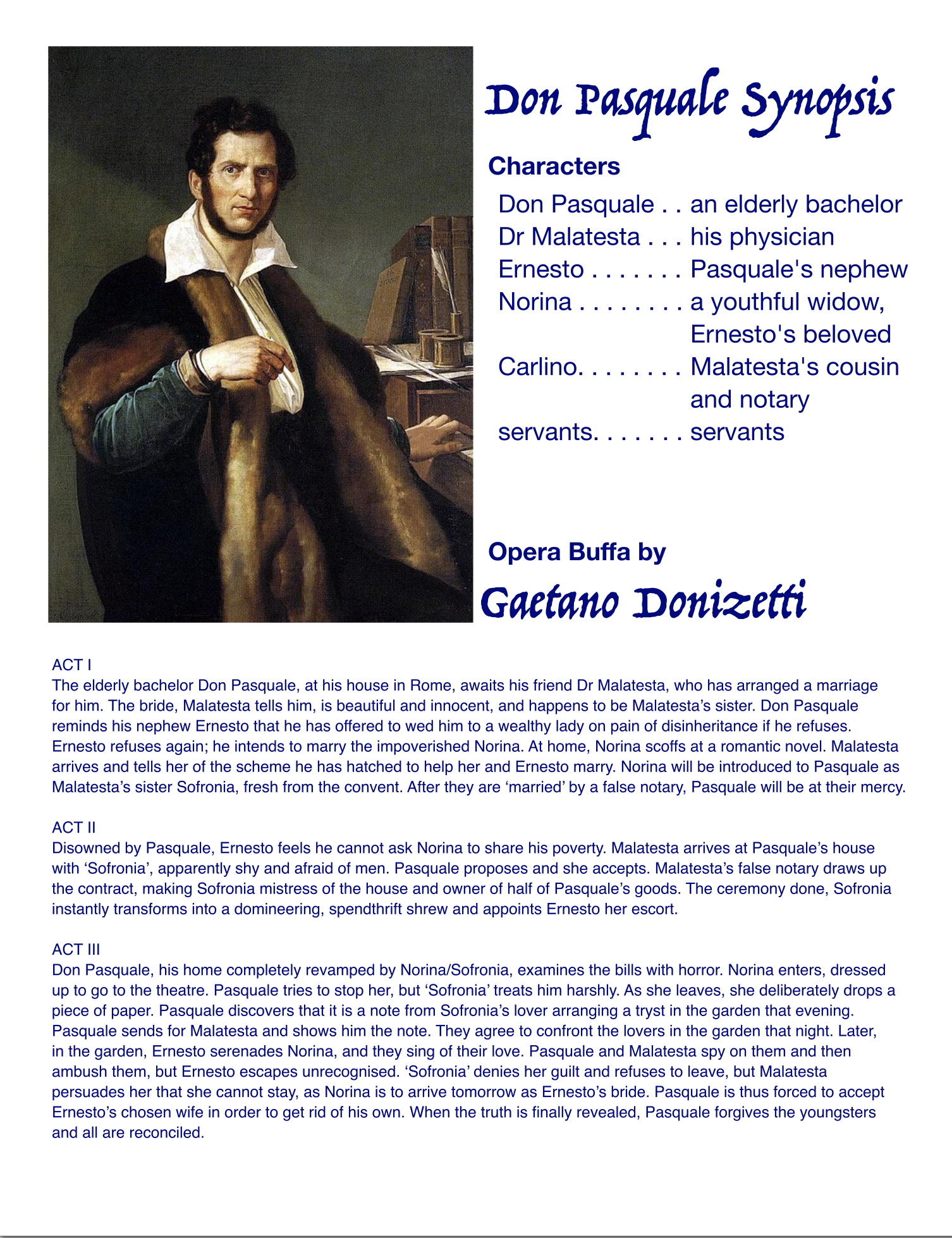 Don Pasquale tells the story of an old rich man attempting to marry in his dotage to generate an heir. It premiered in Paris on Jan 3, 1842 and remains as one of his most popular operas. As a reminder, we have seen two other Donizetti operas: "L'elisir d'amore" and "The Barber of Seville."