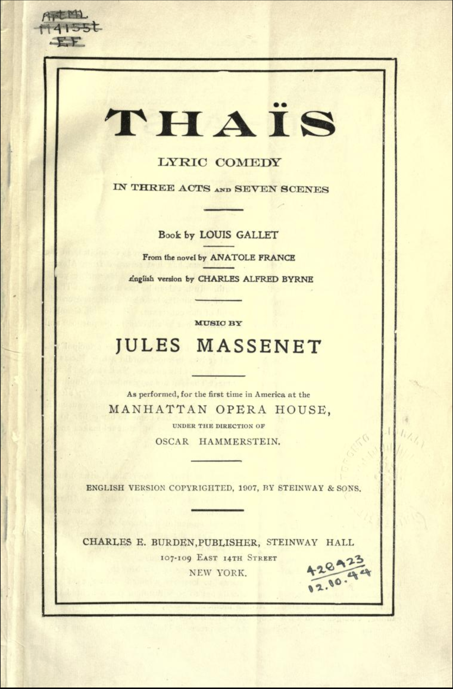 Thaïs libretto in French and English from the 1907 production at the Manhattan Opera Company (a one-time competitor to the Metropolitan Opera).