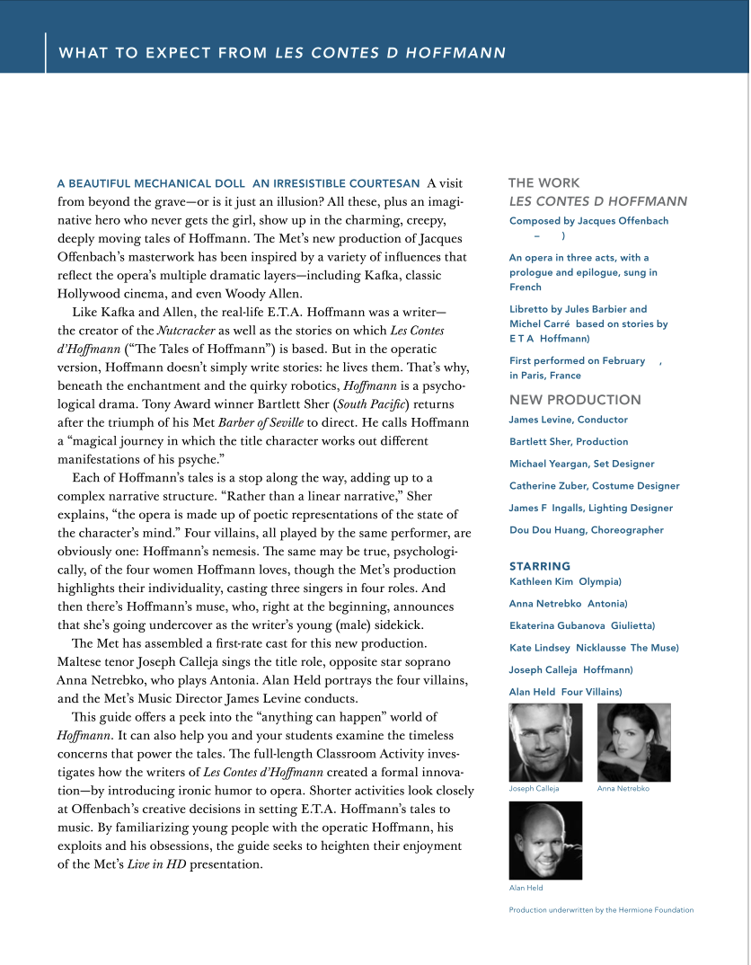 The 2015 Metropolitan Opera revival of the Bartlett Sher staging of "Les Contes d'Hoffmann" featuring Vittorio Grigolo as Hoffmann, Thomas Hampson as the four villians, Erin Morley as Olympia, Hibla Gerzmava as Antonia, Christine Rice as Giulietta, and Kate Lindsey as Nicklausse. English subtitles are available via the YouTube controls. Kate Lindsey has a powerful stage presence and significantly augments any production she is in.
