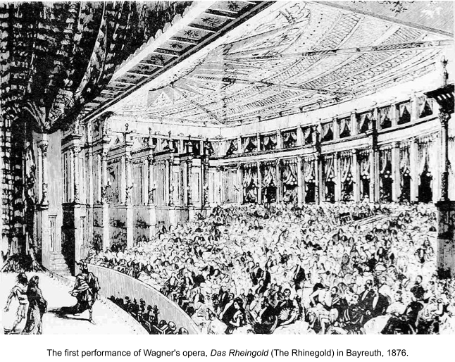 Wagner was a megalomaniac and wanted to re-create - at least the musical world - to his liking. His concept of opera was called gesamtkunstwerk (making use of all art forms). He wanted the artwork, music, costumes, performers to all be specifically designed or chosen to represent his work. To this end, he designed his own venue, Bayreuth, for his music festival at which he premiered Das Rheingold and the rest of his works. (This was also done because he couldn't get bookings in Paris, the then centre of the opera world.) But we owe to Wagner innovations that are with us still. His attention to acoustics led to the below seating level orchestra pit. Before Wagner, musicians were either on the stage or just in front of it. Many smaller European venues are still simply salons all at one level. If you're lucky a portable 6-inch "stage" will be set to place the orchestra, but most audience members in the salon don't actually see the orchstra during the performance - only the back of heads in front of them. Wagner also turned the conductor's back to the audience.